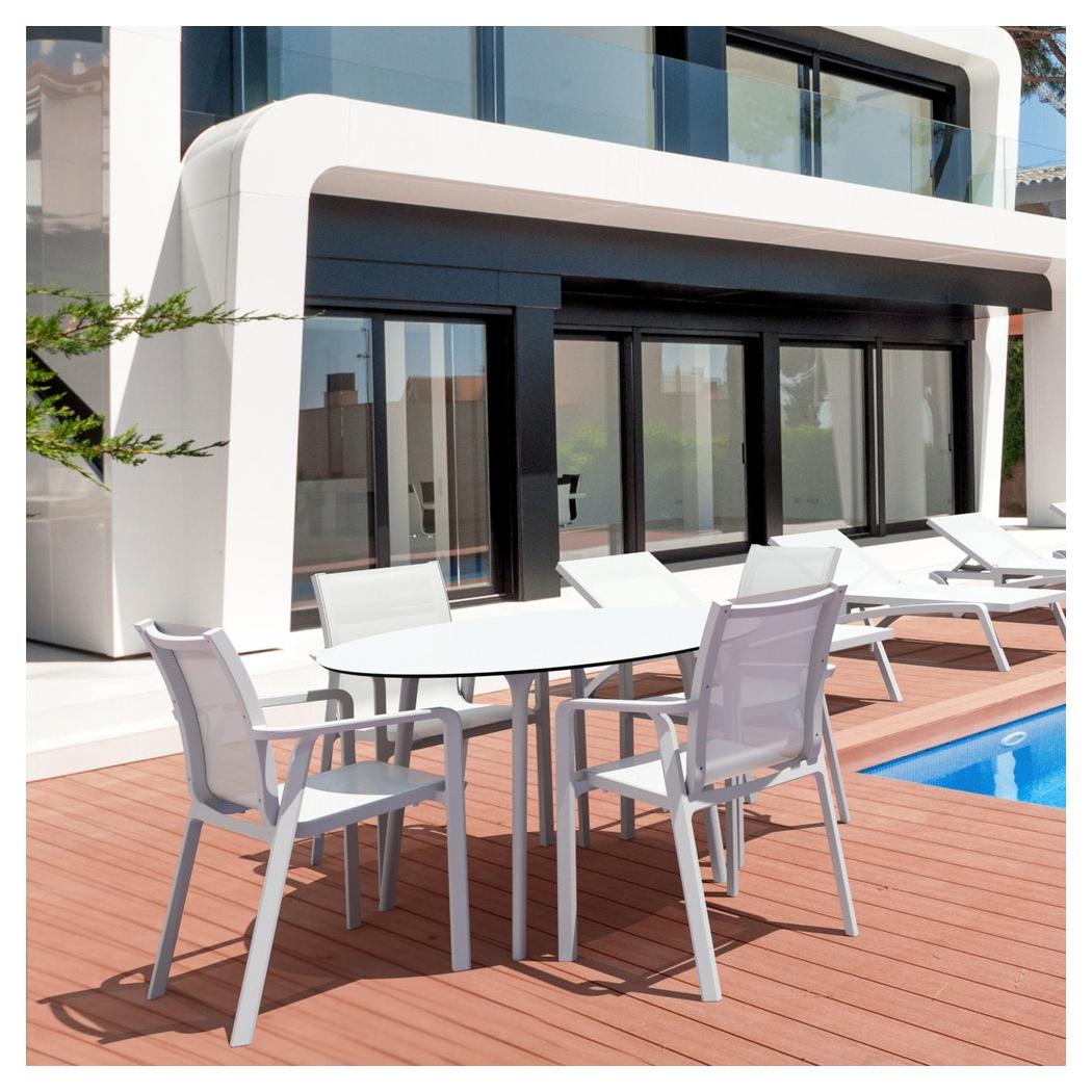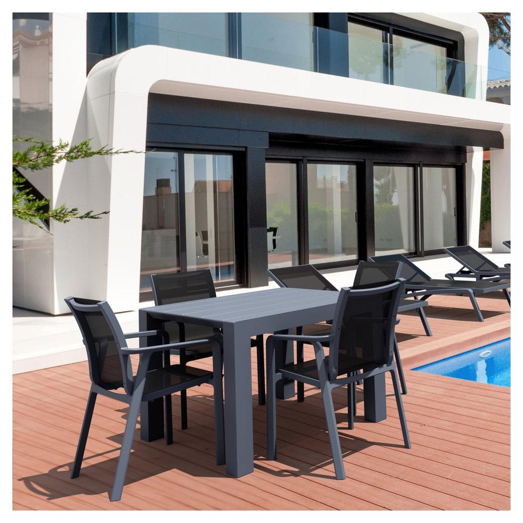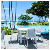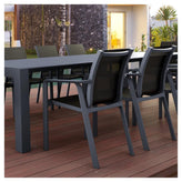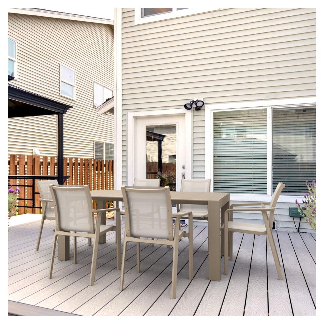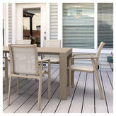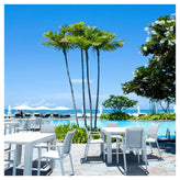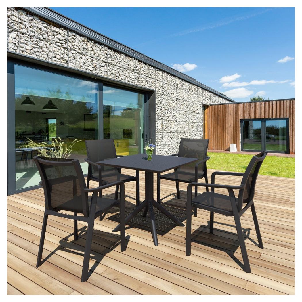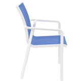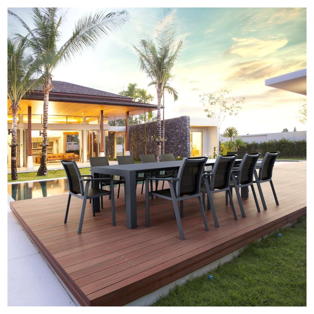 Must be ordered in quantities of 2. Price listed is per item price. Pacific resort quality dining arm chair. Simple sleek design with commercial strength. Sling is made with Serge Ferrari mesh fabric. Chair is very comfortable and no need for cushions. Stacks for easy storage. Frame made of marine grade resin polypropylene. Extremely durable and comfortable. Commercial grade. High quality commercial grade resin furniture - featuring refined designs, that are weatherproof, comfortable, and functional. Preferred for heavy use areas, pool sides, patios, beach and balcony use. Items are resistant to UV, salt, weather, sun tanning oils.