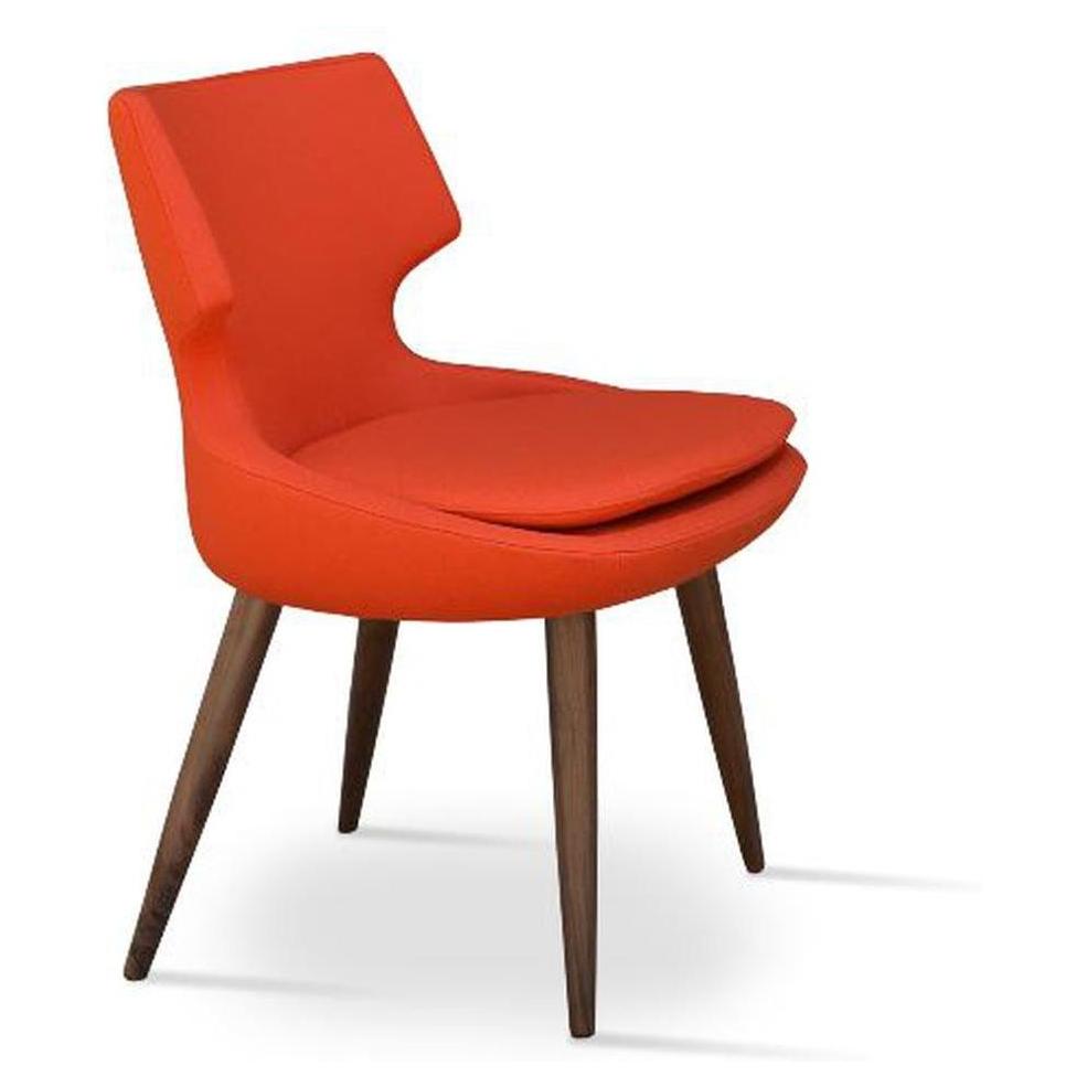 Patara Wood is a modern dining chair with a comfortable upholstered seat and back rest on beech wood legs with a walnut finish. The legs have adjustable pod feet to level the chair on uneven surfaces and the feet are plastic-tipped. Its padded removable seat cushion provides extra comfort. The seat has a steel structure with S shape springs for extra flexibility and strength. This steel frame is molded by injecting polyurethane foam. Patara Wood is suitable for both residential and commercial use.