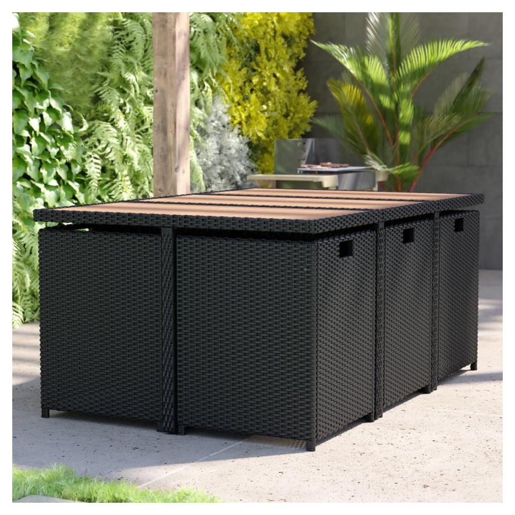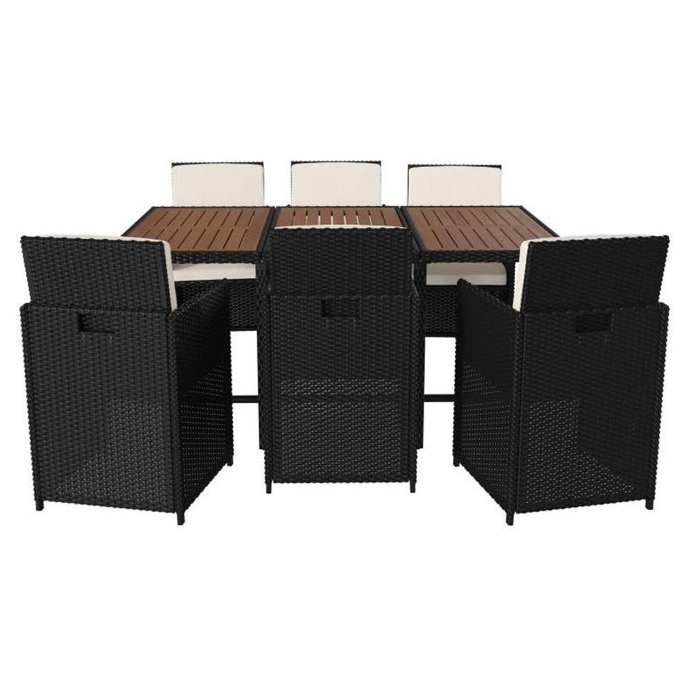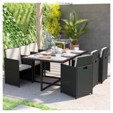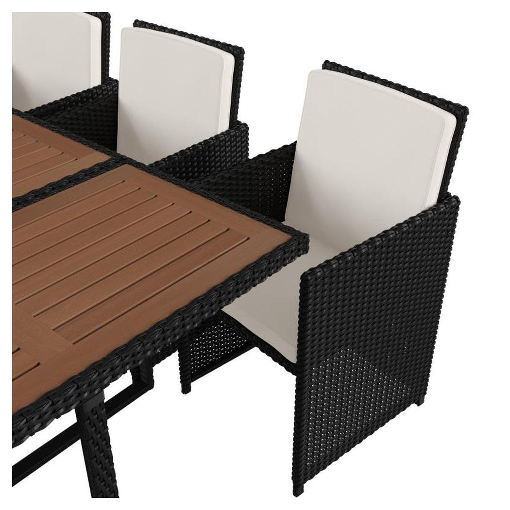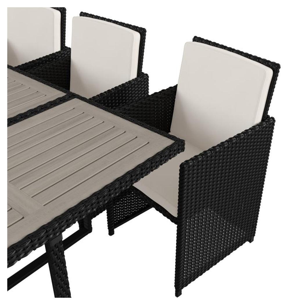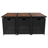 Peregrine 7 Piece Outdoor Patio Dining Set, Space Saving Black Wicker Modular Chairs-Cream Cushions & Natural OR Gray Acacia Wood Table Top
