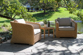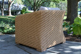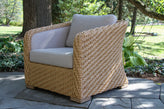 Sahara Wicker Armchair is crafted from Eucalyptus Hardwood, HDPE All-Weather Wicker, Olefin Fabric for a warm, natural look suited for commercial and residential outdoor settings.