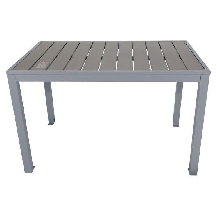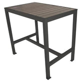 This sleek, outdoor bolt-down Seaside bar height table features a modern design. It is available in soft gray and black powder coat finishes. It has a slatted surface that allows rain to drain. It ships knocked down and requires assembly. It comes with a one-year manufacturer's warranty and our best price guarantee.