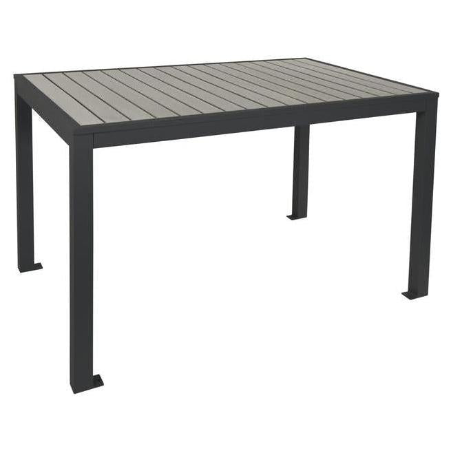This sleek, outdoor bolt-down Seaside dining table features a modern design. It is available in soft gray and black powder coat finishes. It has a slatted surface that allows rain to drain. Umbrella hole available on request & optional weighted umbrella base required (#UB50RD). It ships knocked down and requires assembly. It comes with a one-year manufacturer's warranty and our best price guarantee.