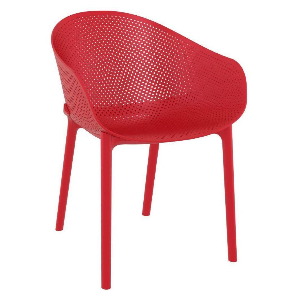Sky indoor outdoor dining armchair. Simple modern European design. New addition to our indoor-outdoor transitional chairs. It's made with polypropylene construction and a poly seat. Chair legs are reinforced with fiber glass. Contemporary chairs can be used indoors or outdoors. Chairs are maintenance free. Made for commercial use in hotels, restaurants and heavy use areas.