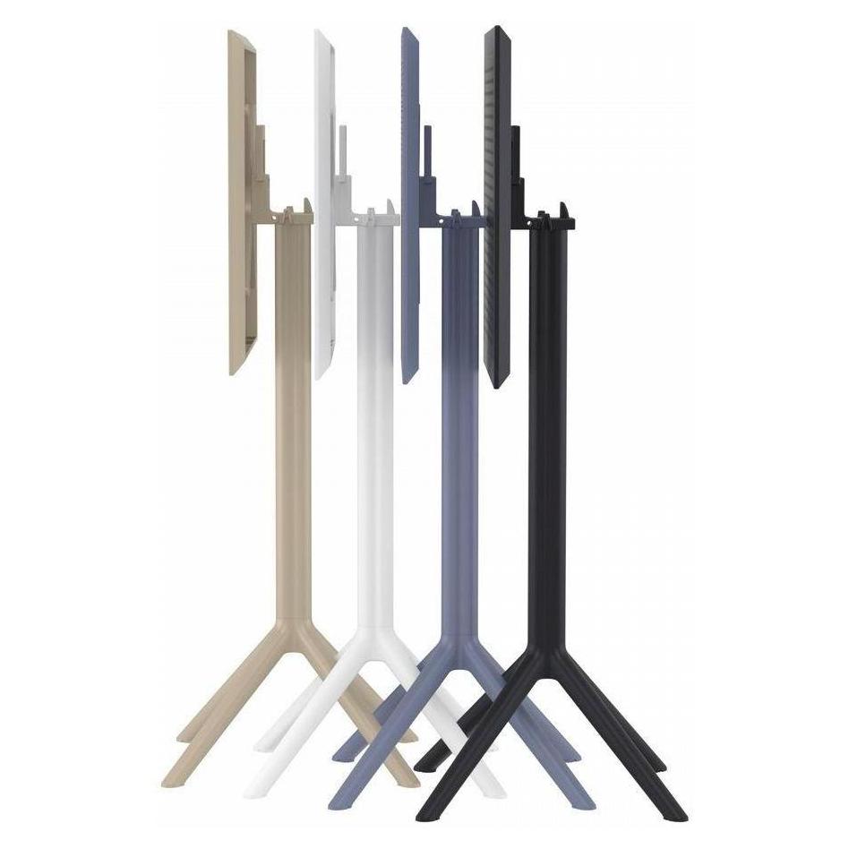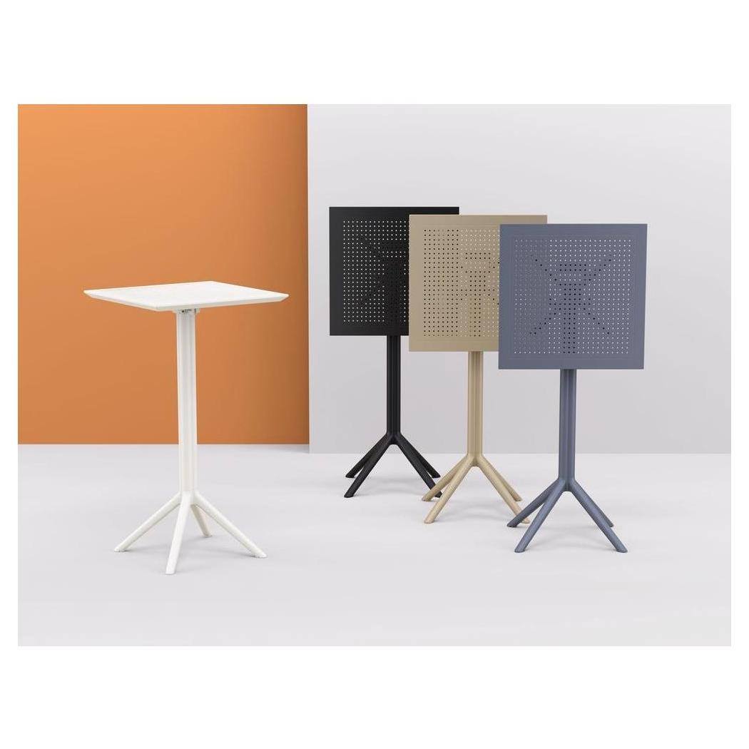 Sky resin outdoor bar height table with 24 inch folding square top. Both top and body are made of high quality polypropylene for durability and a stable posture. Table top has pinholes that helps with rainwater drainage and creates a modern look. One touch, easy folding. Extremely durable for outdoor environments. Table is perfect for balcony, pool, beach and heavy use areas. Resistant to suntan oils, chlorine and saltwater. UV protected. For indoor and outdoor use. This product is protected by our one year product warranty.