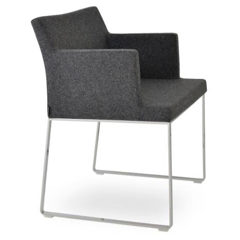 This Soho Armchair with Metal Sled Base is a commercial grade chair designed to last and look great in your restaurant. The chair fits in nicely for restaurants desiring a modern design. It is made of metal, wool fabric. There is a wide range of colors for this chair. This product is backed by our customer satisfaction return policy and our best price guarantee.