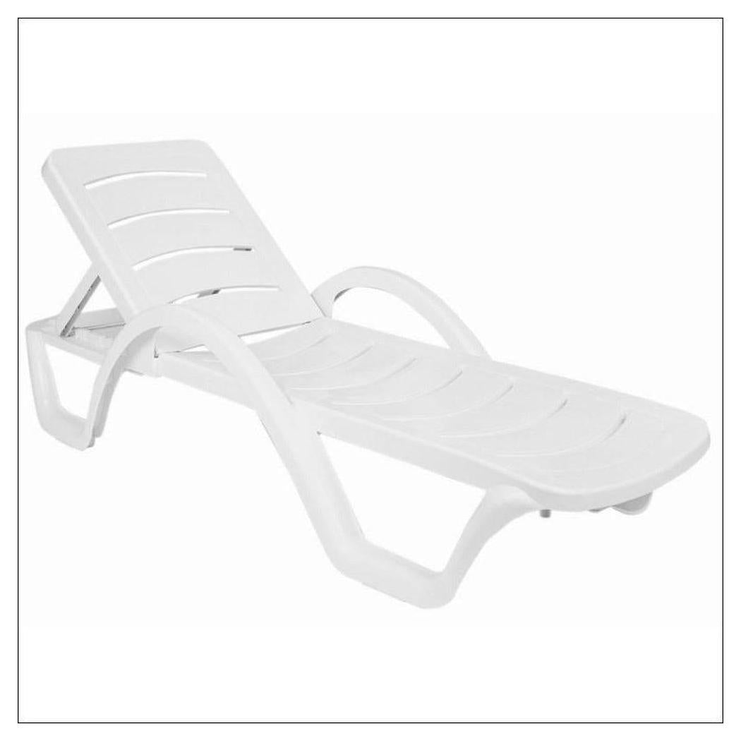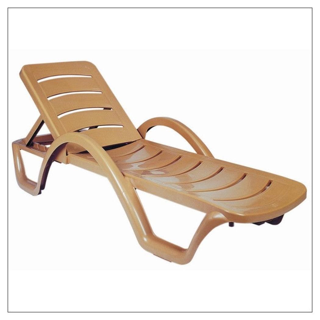 Your bar will look great with this durable, foodservice grade Sunrise Pool Chaise Lounge catering to the budget price point. This chaise lounge fits in nicely for restaurants desiring a modern design. This chaise lounge is made of the highest-quality commercial grade resin and is available in teak brown, green and white color. This product is backed by our customer satisfaction return policy and our best price guarantee. Sunrise pool chaise with arms. Chaise back adjustable to 4 positions and folds flat. Pool chaise has hidden wheels on the back legs for easy mobility. Strong armrests. Strong and stable legs. Resistant to suntan oils, chlorine and saltwater. |