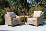 Teak & Ash Wicker Armchair w Sunbrella Sunbrella Cushions is crafted from FSC-Certified Teak Hardwood, HDPE All-Weather Wicker, Powder-Coated Aluminum, Sunbrella Fabric for a warm, natural look suited for commercial and residential outdoor settings.