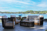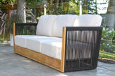 Teak & Black Rope Sofa w Sunbrella is crafted from FSC-Certified Teak Hardwood, Nautical-Grade Rope, Powder-Coated Aluminum , Sunbrella Fabric for a warm, natural look suited for commercial and residential outdoor settings.