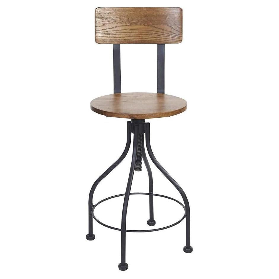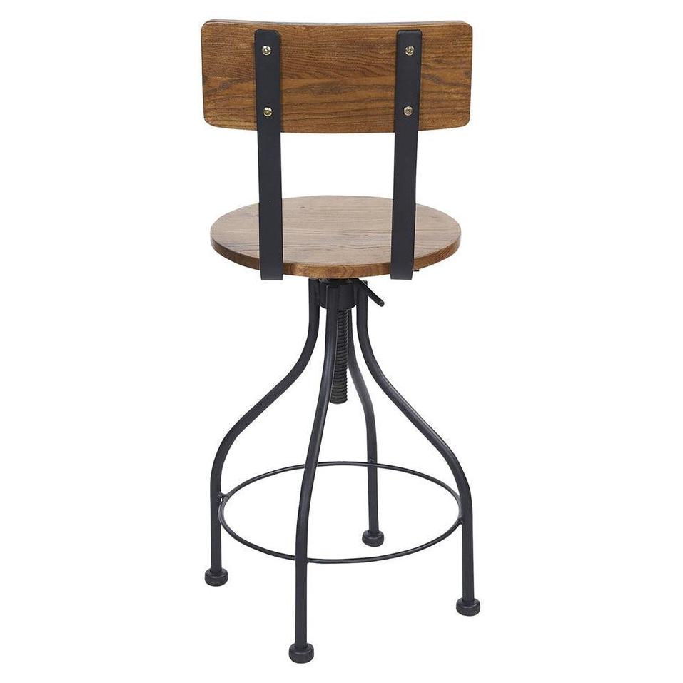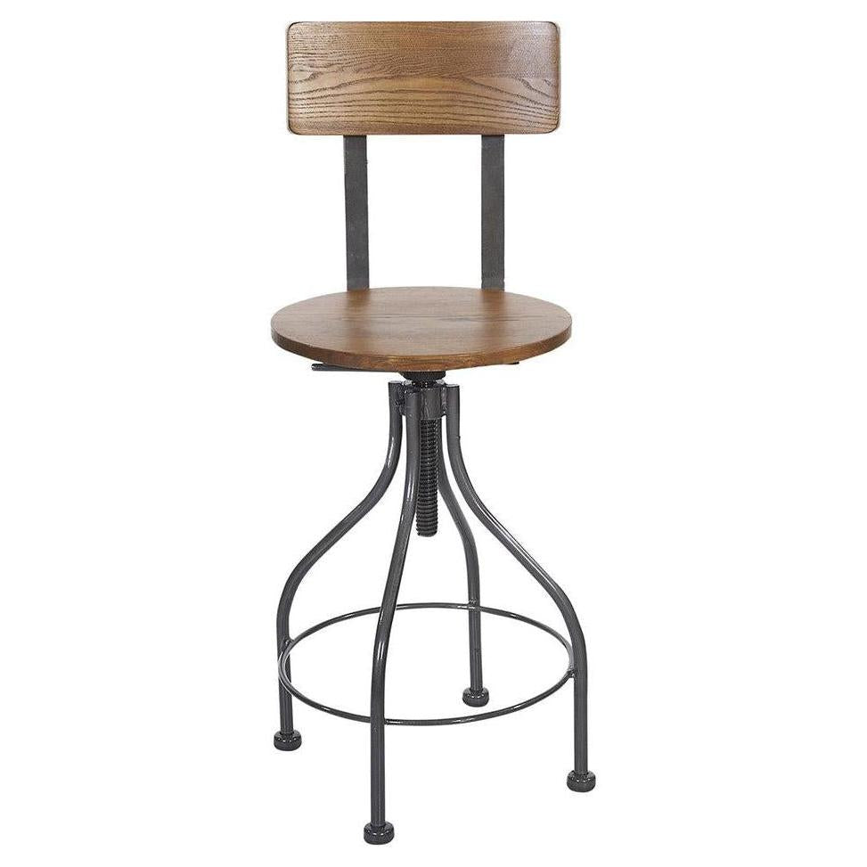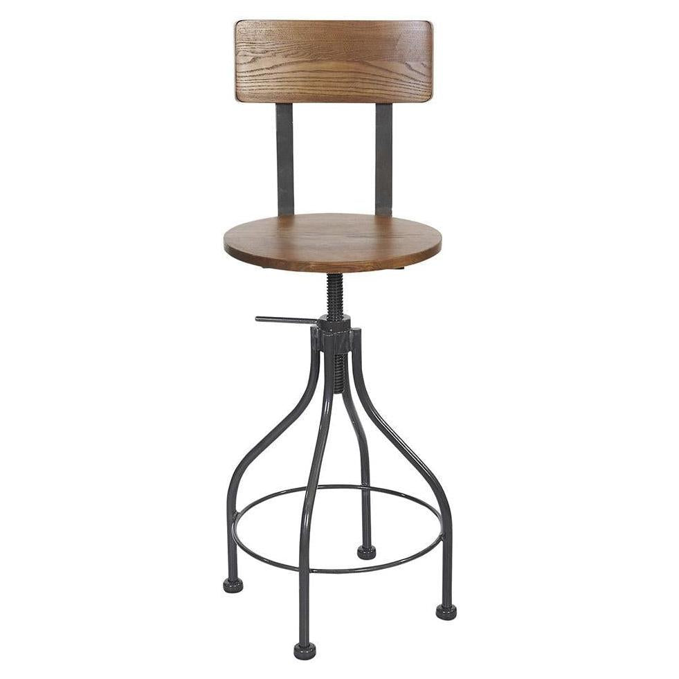 This modern Screw Barstool Wood Back features an industrial design. It is available in clear coat, sand black powder coat finish. It is adjustable with locking screw at counter height and bar height. Upgraded upholstery options available. It comes with a one-year manufacturer's warranty and our best price guarantee.
