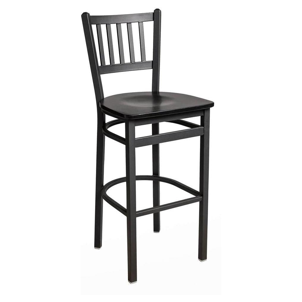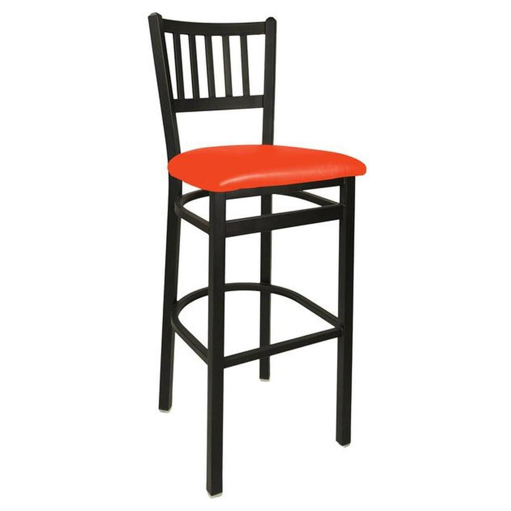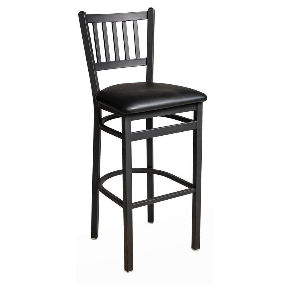 This modern Troy Slat Back Bar Stool features a classic ladder design. It is available in sand black powder coat finish. Upgraded upholstery options available. It comes with a one-year manufacturer's warranty and our best price guarantee.